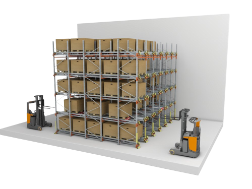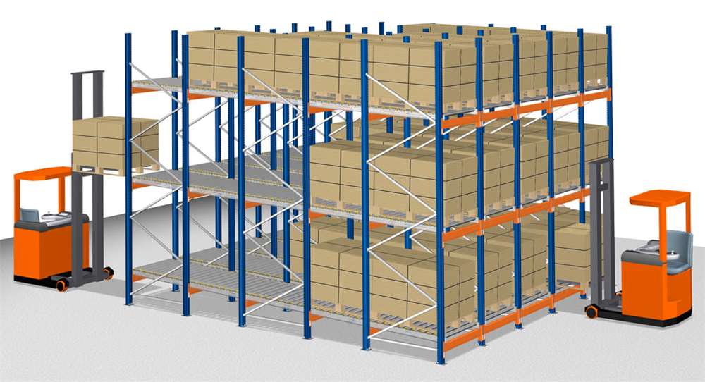 Pada sistem rak Drive-Thru / Flow Through palet di muat di satu ujung dan di dorong ke ujung yang lain. Palet pertama yang dimasukan ke dalam baris tersebut adalah yang pertama di ambil di ujung yang lain. Sistem ini menguntungkan untuk perusahaan adan yang memiliiki bahan / barang dengan tanggal kadaluarsa atau di mana umur simpan merupakan perhatian utama.